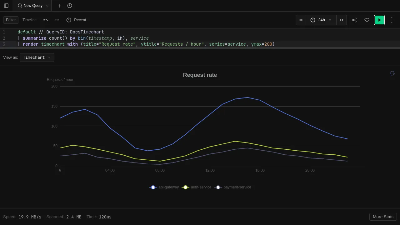 The Timechart view renders results as a line chart with time on the x-axis. Best for visualizing trends, rates, and patterns over time.