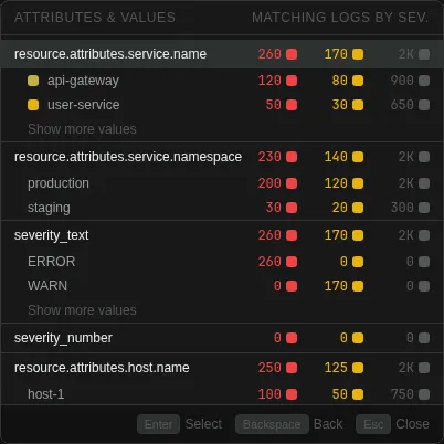 Build filters visually using the filter bar. Each filter appears as a chip showing the field, operator, and value. Click the filter input to open a three-step popover that walks you through building a filter. The field names and values shown in the popover are gathered from the current data using the otel-log-stats operator.