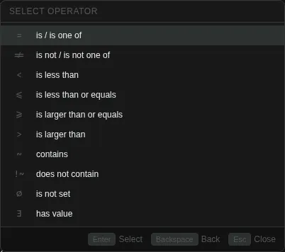 The popover lists every field found in the current result set. Click a field name to advance to the operator step, or click a field's value directly to add an equals filter in one click.