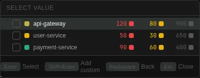 Pick one or more values. Click a value to create the filter immediately, or tick checkboxes to select multiple values and press Enter to confirm. You can also type a custom value and press Shift+Enter to add it to the selection.