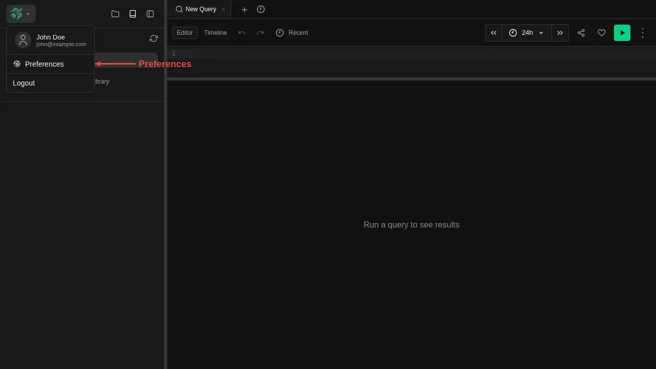 Open the settings dialog by clicking the logo menu in the top-left corner, then selecting Preferences.
